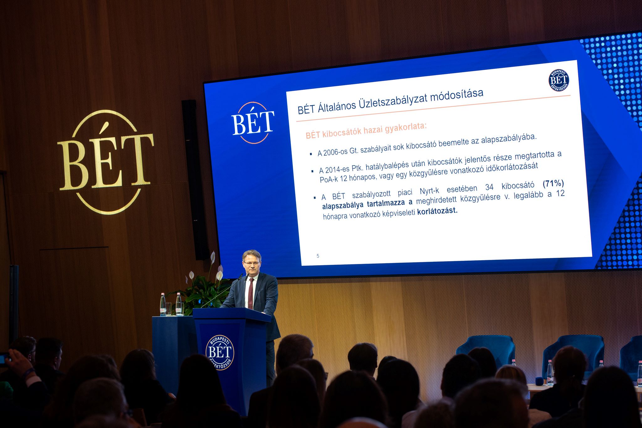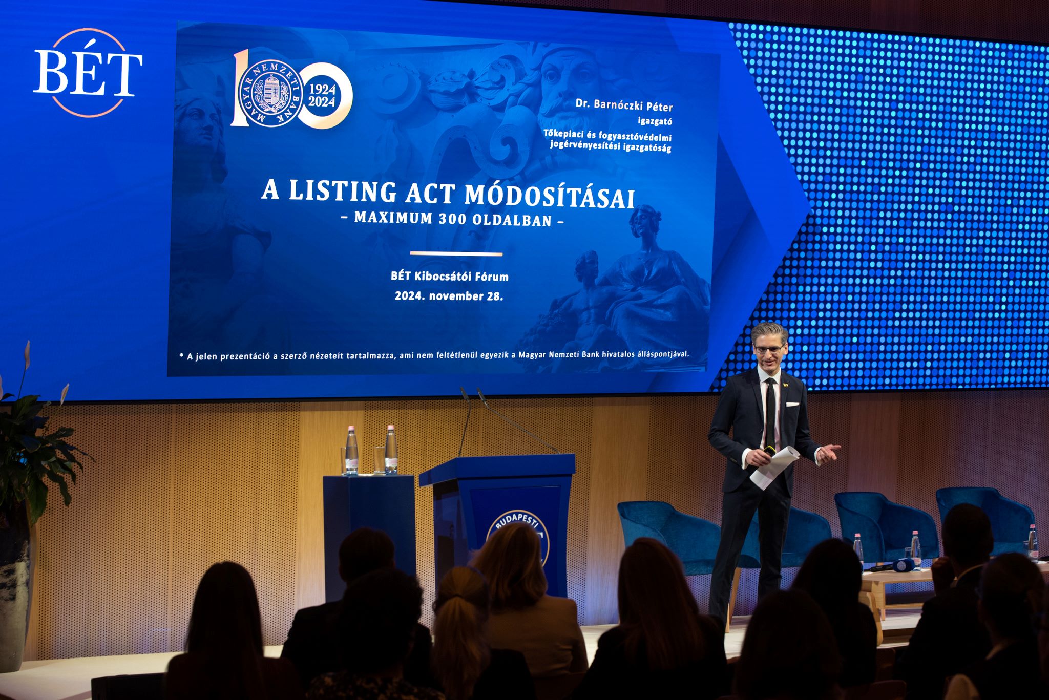 A Kibocsátói Fórum további részében dr. Barnóczki Péter, a Magyar Nemzeti Bank Tőkepiaci és fogyasztóvédelmi jogérvényesítési igazgatóság igazgatója számolt be az Európai Unió tőkepiaci jogszabályok várható módosításairól. A konferencia zárásaként a BÉT Általános Üzletszabályzatának a kibocsátókat érintő változásairól beszélt dr. Dobrocsi László, a Budapesti Értéktőzsde Kereskedési, Üzletfejlesztési és Kibocsátói Igazgatóságának igazgató-helyettese.