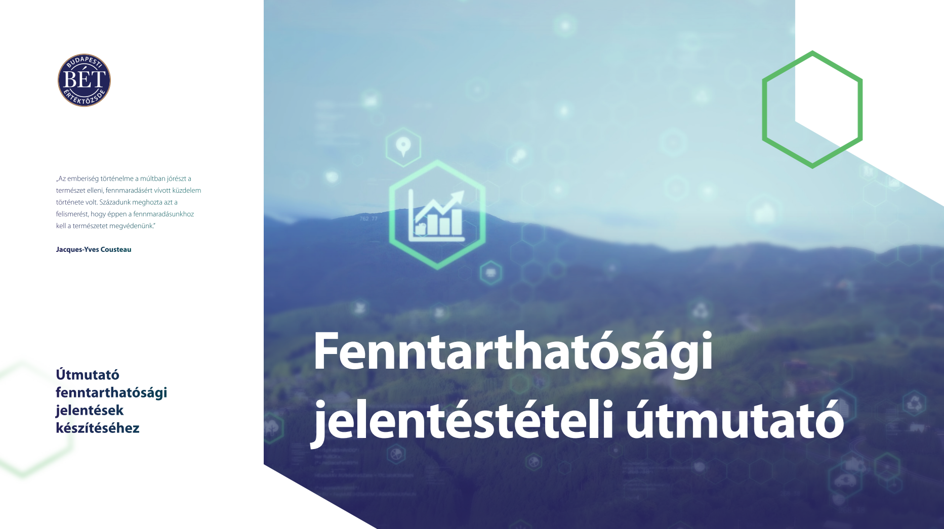 A környezettudatos és fenntartható vállalati működés az elmúlt évtizedekben globálisan és hazai szinten is alapvető elvárássá vált. A tőkepiacok számára különösen fontos, hogy a tőzsdén jegyzett társaságok nemcsak gazdasági szerepüket, hanem társadalmi és környezeti felelősségüket is megfelelően érvényesítsék. A BÉT a fenntarthatóság területén végzett munkáját a piaci szereplők számára szabályozási és oktatási programokkal, valamint a tőkepiaci infrastruktúra fejlesztésével támogatja. Ennek keretében 2021 februárjában bemutatta az ESG Jelentési Útmutatóját, amely iránymutatást adott a hazai tőkepiaci szereplők fenntarthatósági törekvéseinek összehangolásához. Az elmúlt években történt jogszabályváltozások szükségessé tették az útmutató megújítását, amely a BÉT Fenntarthatósági és Társaságirányítási Bizottságának keretében valósult meg.