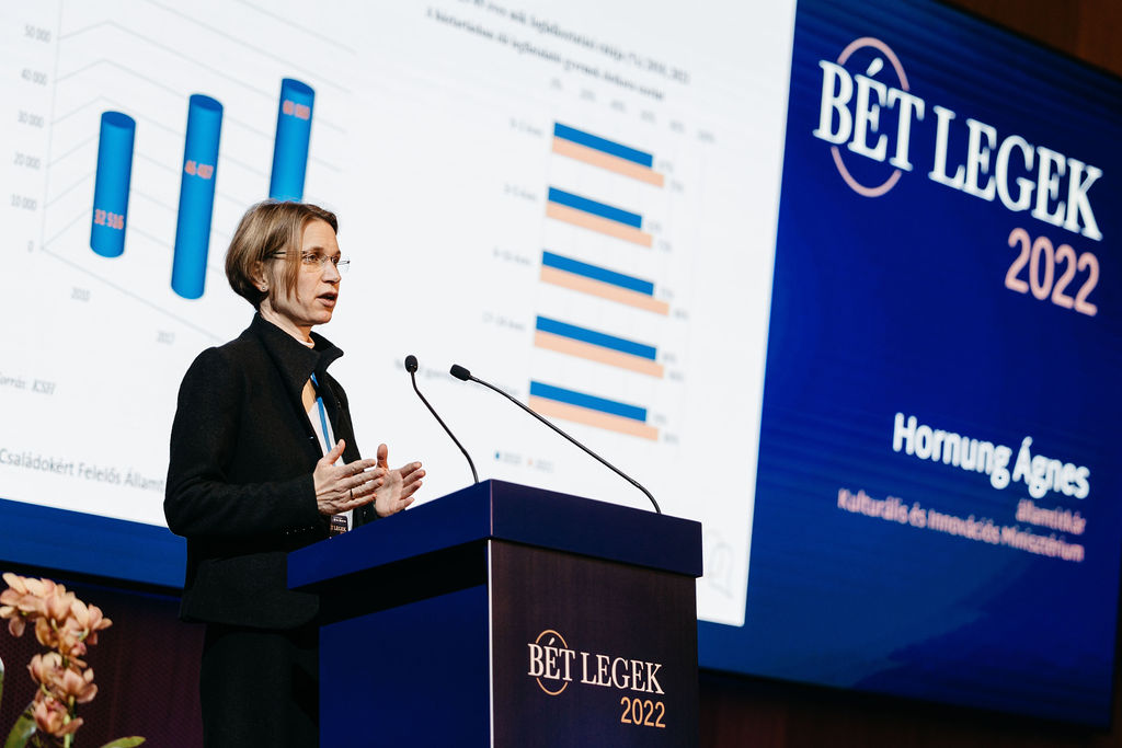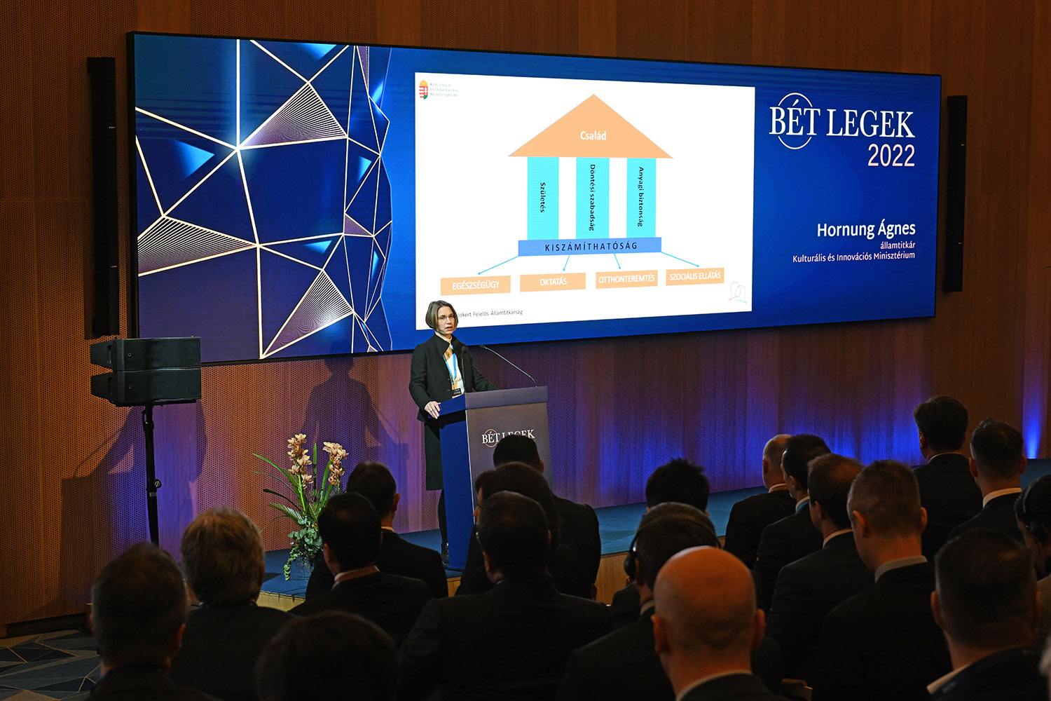 Dr. Patai Mihály elnöki köszöntőjét követően Hornung Ágnes családokért felelős államtitkár gratulált a díjazottaknak, majd ’Családtámogatások pénzügyi szempontú megközelítése’ címmel tartott előadást.