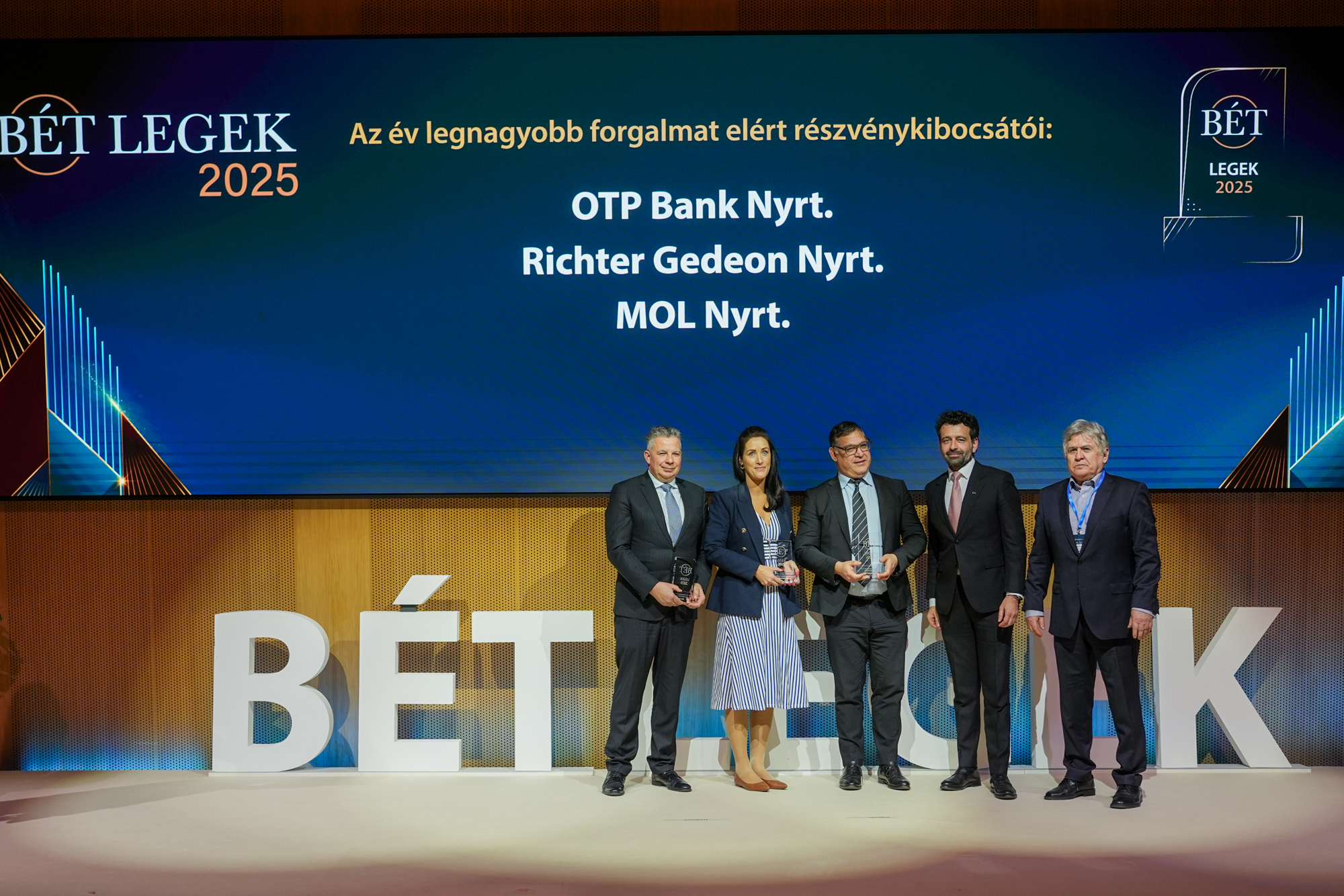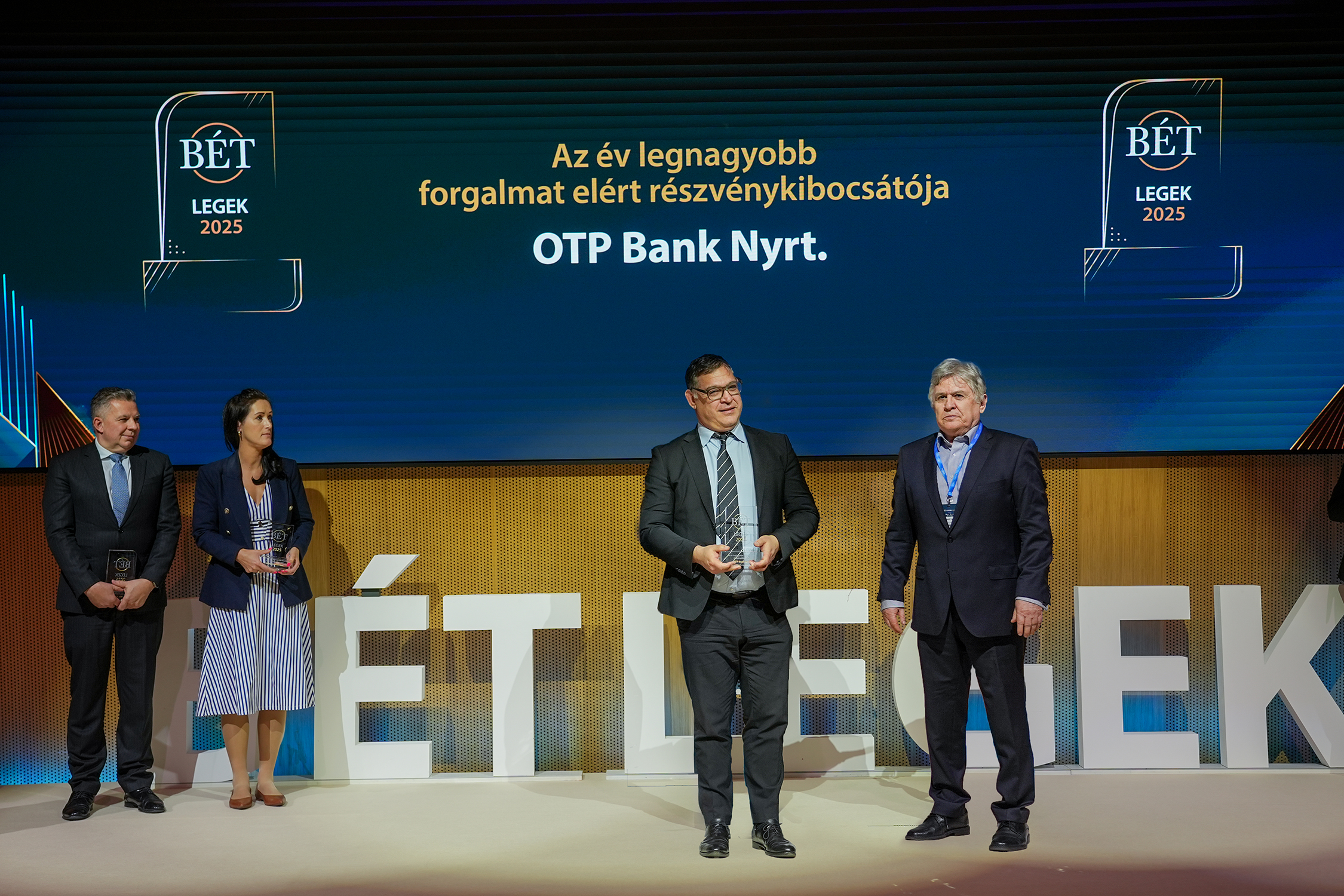 A 2025. évi teljesítménye alapján az OTP Bank kapta a legtöbb elismerést az idei BÉT Legeken, összesen négy díjjal büszkélkedve. A hitelintézet nyerte el „Az év befektetési szolgáltatója”„Az év legnagyobb forgalmat elért részvénykibocsátója”, a „Kibocsátói transzparencia díj” és a „Felelősségvállalás, fenntarthatóság, felelős vállalatirányítási díj” kategóriákat. A legnagyobb forgalmat elért részvénykibocsátók rangsorában az OTP Bankot a Richter Gedeon követte a második, a MOL pedig a harmadik helyen.