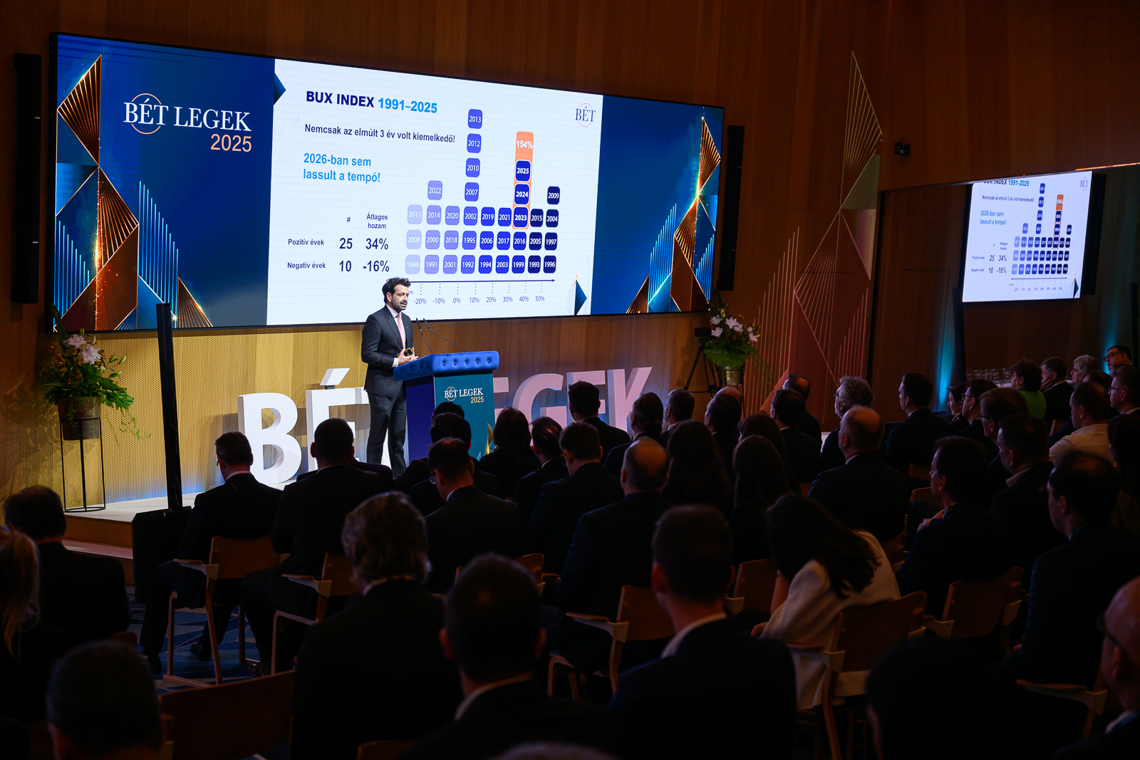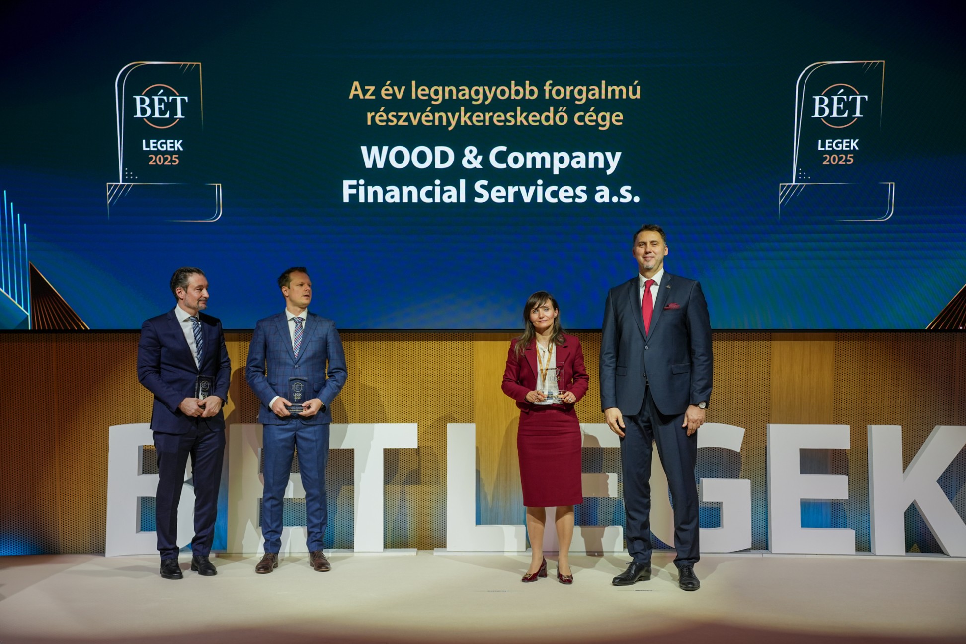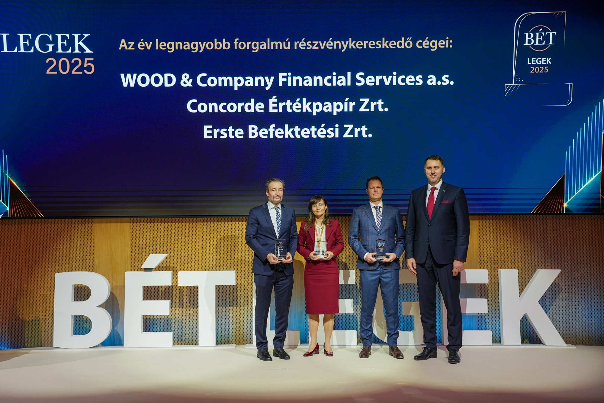 A befektetési szolgáltatók között a legnagyobb forgalmú részvénykereskedőnek járó elismerést immár többedik alkalommal a WOOD & Company szerezte meg, a brókercég a 2025-ös évben összesen 2371 milliárd forint értékben kötött ügyleteket. A határidős BUX index- és részvénykereskedelemben az Erste Befektetési Zrt., a határidős devizapiacon a Raiffeisen Bank érte el a legnagyobb forgalmat, „Az év elemző műhelye” díjat pedig a Concorde Értékpapír kapta.